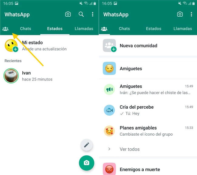 Crear una Comunidad en WhatsApp o acceder a ellas es muy fácil, pues ahora tendremos la pestaña de Comunidades en la parte izquierda, en la misma barra donde encontramos los chats, los estados y las llamadas.