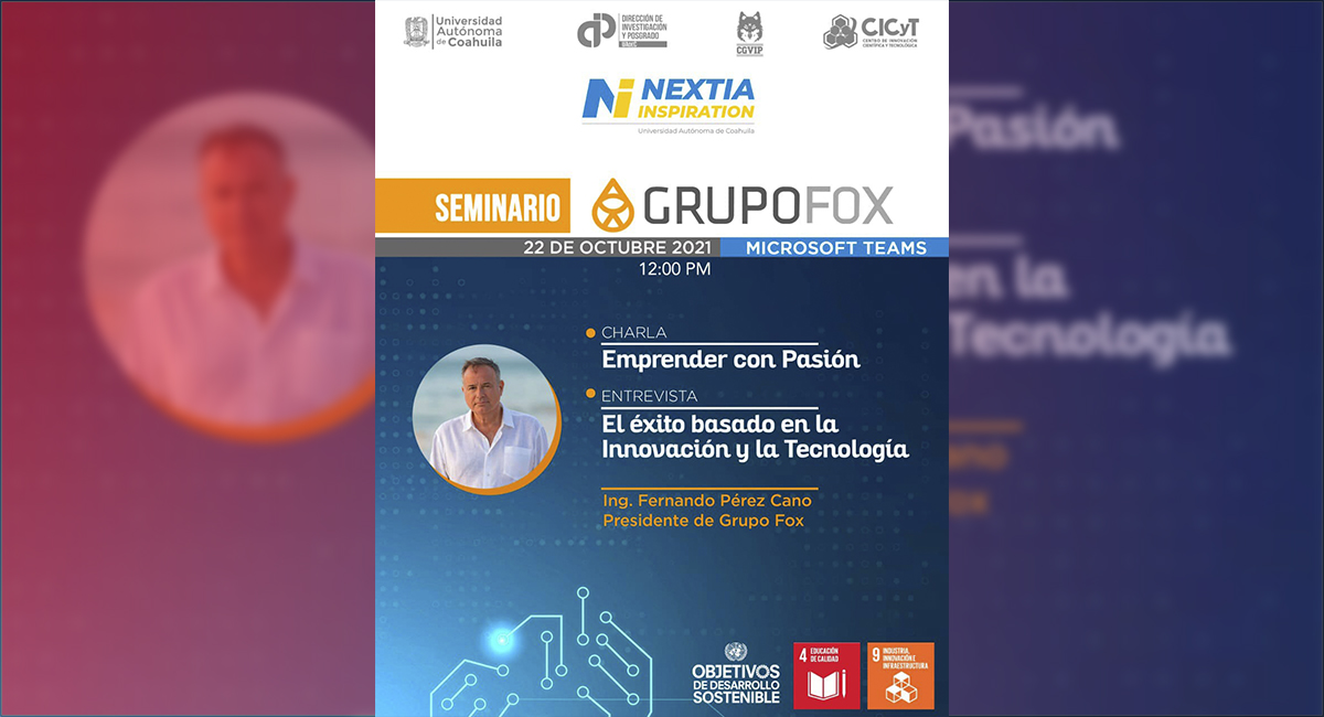 Gracias a la vinculación de la Universidad Autónoma de Coahuila con el sector empresarial, la Dirección de Investigación y Posgrado a través de su Centro de Innovación Científica y Tecnológica (CICYT-UAdeC), convoca a la comunidad universitaria y al público en general al Seminario con Grupo FOX, por medio de Microsoft Teams y por Facebook Live @UniversidadAutonomadeCoahuilaOficial, este viernes 22 de octubre a partir de las 12:00 horas.