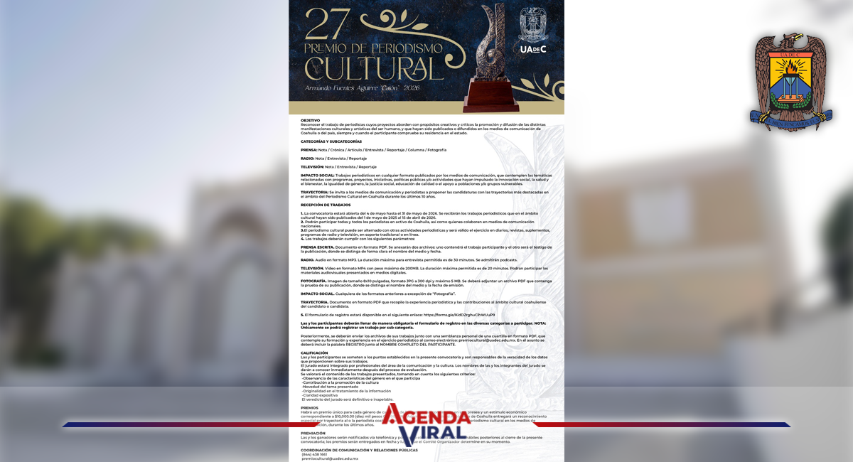 SALTILLO, Coahuila.- Del 4 al 31 de mayo de 2026, la Universidad Autónoma de Coahuila convoca a periodistas en activo del estado y a quienes colaboren en medios nacionales, a participar en la Edición 27 del Premio de Periodismo Cultural Armando Fuentes Aguirre “Catón”.
