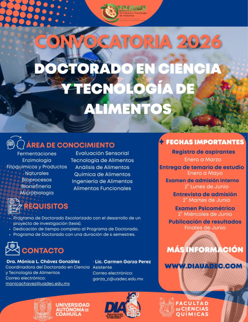 Para más información, comunicarse con la coordinadora del Doctorado en Ciencia y Tecnología de Alimentos, Mónica Lizeth Chávez Gonzáles a través del correo electrónico monicachavez@uadec.edu.mx o con la asistente, Carmen Garza Pérez al correo garza_c@uadec.edu.mx.