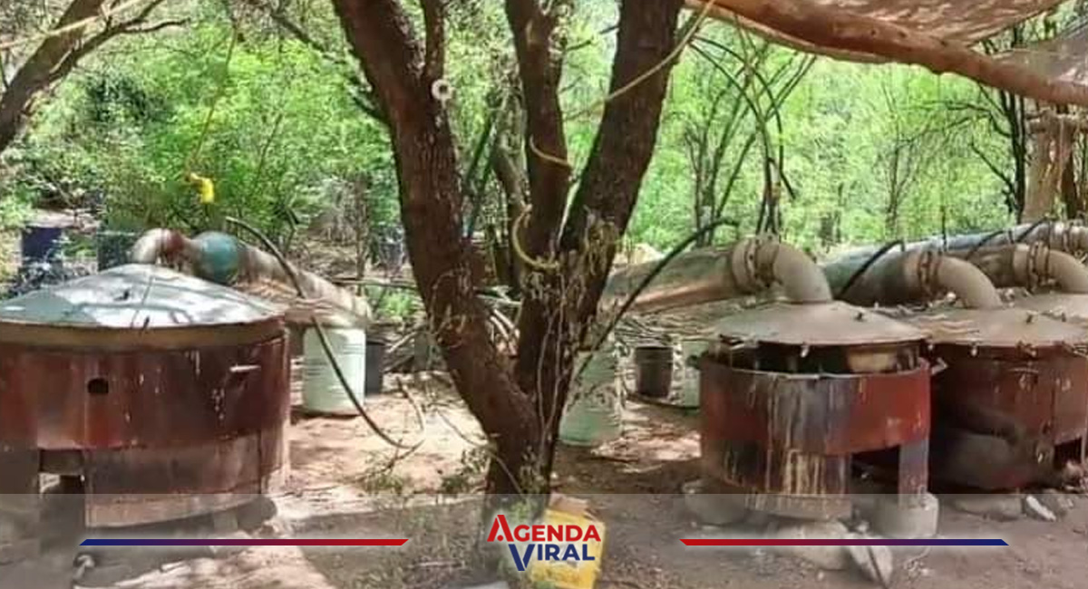 Se encontraron también por lo menos 1,000 sacos de precursores químicos, tres tinas con una sustancia de un color claro, varios costales de sosa cáustica amontonadas sobre unas estructuras de color negro, una carretilla, diversos botes de color negro y otros de mayor tamaño que estaban debajo de un techo sostenido por palos de madera.