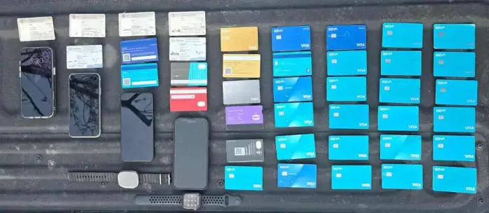 Durante la inspección, policías localizaron más de 30 tarjetas bancarias en poder de los ocupantes, presuntamente obtenidas de manera ilícita.