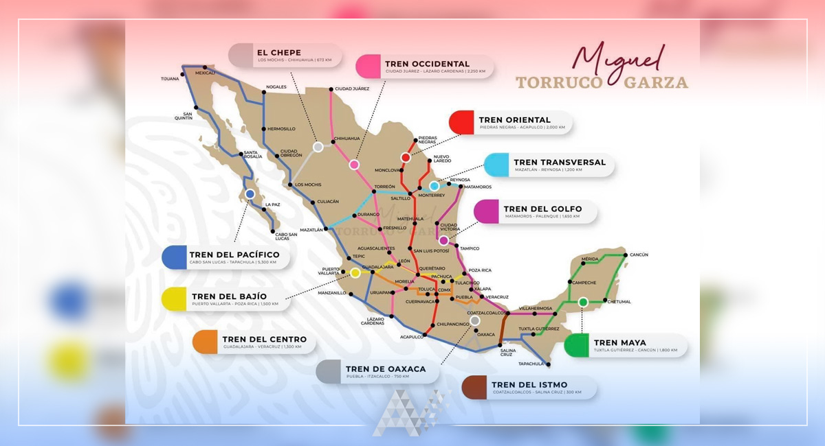 El diputado de Morena, Miguel Torruco, publicó en su cuenta de Twitter las que serían las rutas de los trenes de pasajeros, iniciativa con la que buscan que este medio de transporte vuelva a México, luego de que hace unas décadas era uno de los transporte más usados, pero que desaparecieron luego de ser privatizados, según ha dicho el presidente López Obrador.