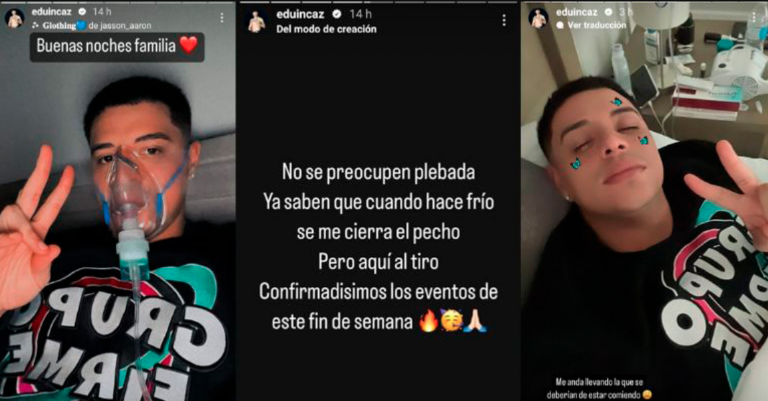 Tan solo hace unas semanas, Eduin Caz encendió las alarmas luego de compartir unas fotos en las que se le podía ver con una mascarilla que le suministraba oxígeno. Posterior a dichas imágenes, el cantante indicó que recibiendo nebulizaciones para mejorar su respiración