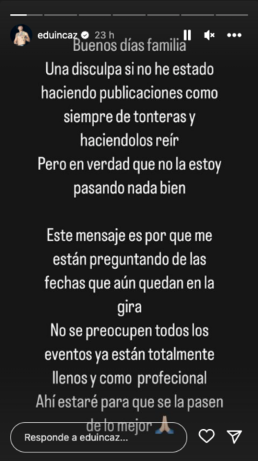 “Una disculpa si no he estado haciendo publicaciones como siempre de tonterías y haciéndolos reír… Pero en verdad que no la estoy pasando bien.. Todos los eventos ya están totalmente llenos y como profesional así estaré”, escribió el intérprete de «En tu perra