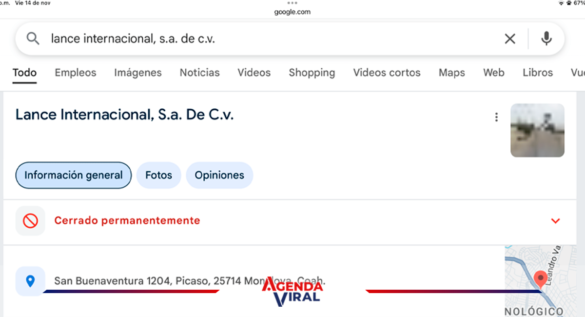 Monclova, Coah. — La presunta empresa coahuilense que busca adquirir Altos Hornos de México (AHMSA), identificada como Lance Internacional S.A. de C.V., aparece en Google como “cerrada permanentemente”, sin especificar desde cuándo. El buscador señala además que el sitio fue visitado recientemente por Google Maps, el cual constató que el lugar está en esa condición.