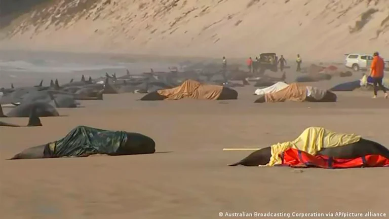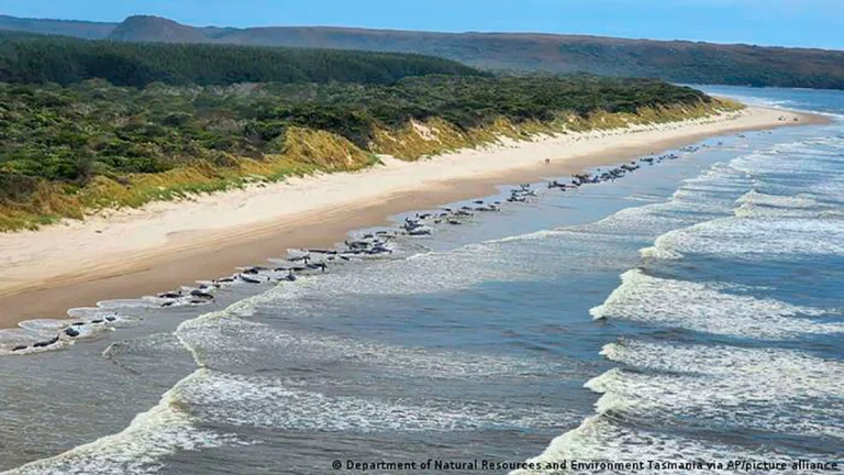 Más de 200 ballenas quedaron varadas en una remota playa de la bahía de Macquarie, en el oeste de la isla australiana de Tasmania. Solo la mitad parecen estar vivas, según las autoridades.