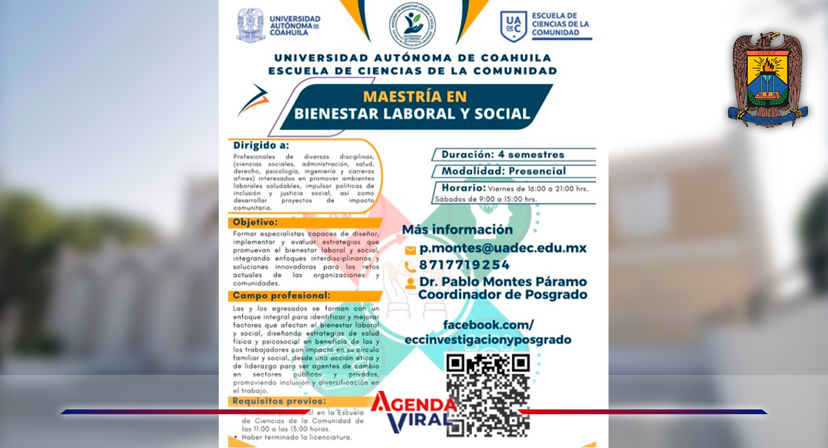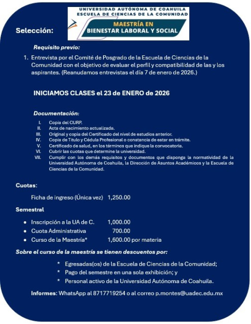 TORREÓN, Coahuila. 6 de enero de 2025. La Universidad Autónoma de Coahuila a través de la Escuela de Ciencias de la Comunidad Unidad Laguna, convoca a profesionales interesados en promover ambientes laborales saludables, impulsar políticas de inclusión y justicia social, así como desarrollar proyectos de impacto comunitario, a estudiar la maestría en Bienestar Laboral y Social, cuyas clases inician el 23 de enero de 2026.