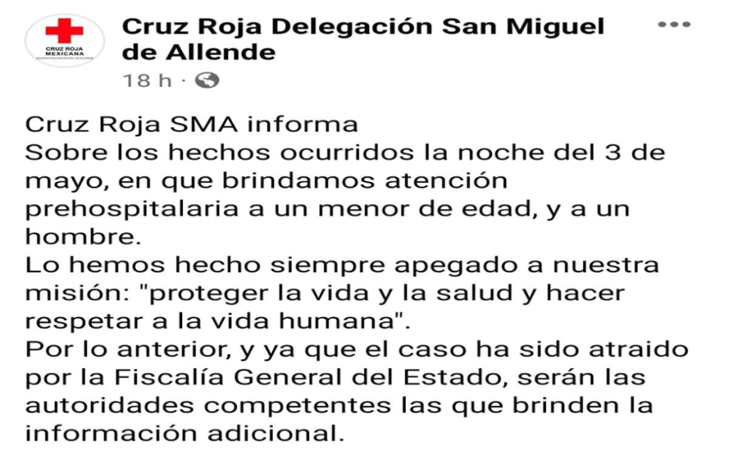 “Sobre los hechos ocurridos la noche del 3 de mayo, en que brindamos atención prehospitalaria a un menor de edad, y a un hombre. Lo hemos hecho siempre apegado a nuestra misión: ‘proteger la vida y la salud y hacer respetar a la vida humana’. Por lo anterior, y ya que el caso ha sido atraído por la Fiscalía General del Estado, serán las autoridades competentes las que brinden la información adicional”.