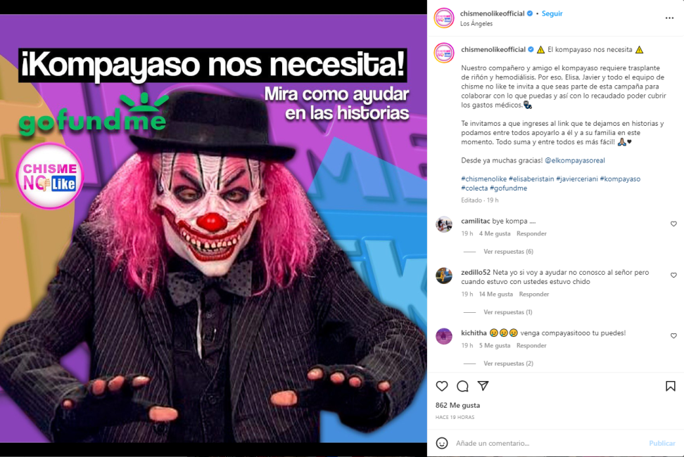 «Elisa, Javier y todo el equipo de Chisme No Like te invitan a que seas parte de esta campaña para colaborar con lo que puedas y así, con lo recaudado, poder cubrir los gastos médicos».
