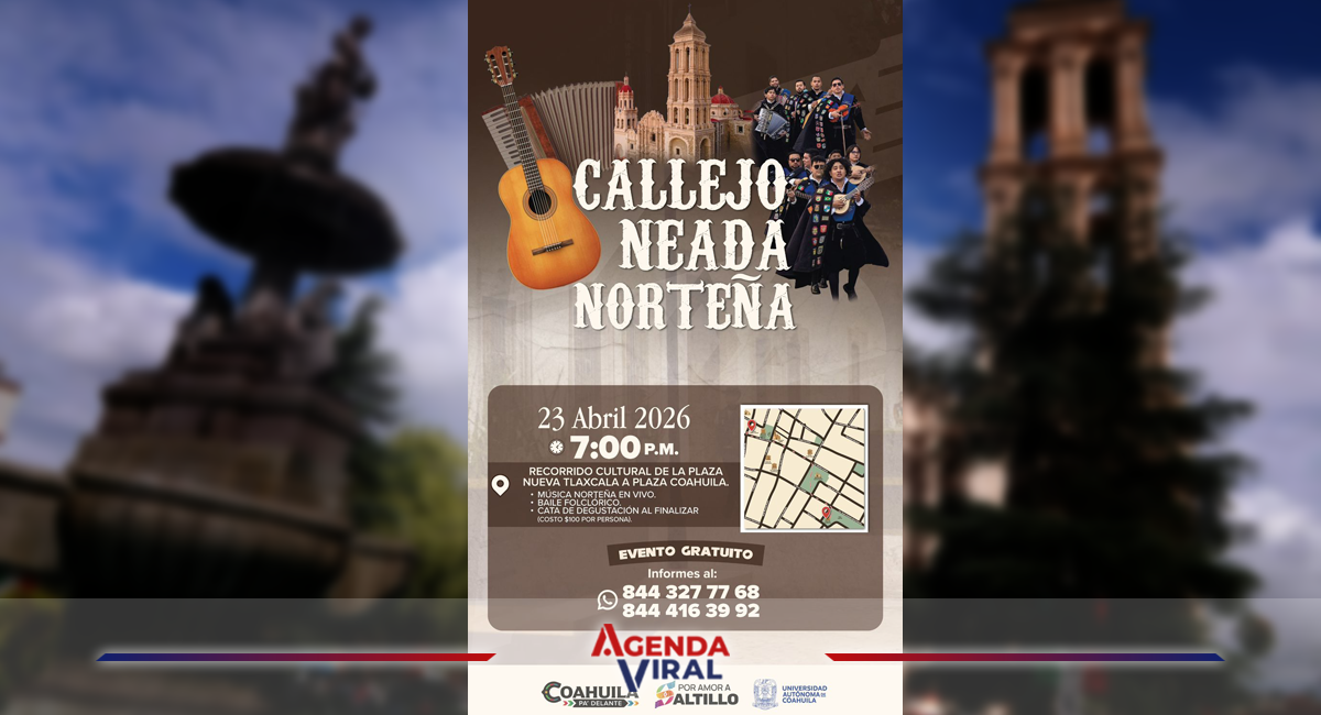 Saltillo, Coahuila de Zaragoza; 23 de abril de 2026.- Este jueves 23 de abril se llevará a cabo en Saltillo la Callejoneada Norteña en el Centro Histórico, en la que se conjuntarán la música, el baile y la convivencia social.