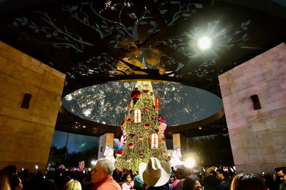 Melchor Múzquiz, Coahuila de Zaragoza; a 30 de noviembre de 2025.- Desde Múzquiz, el gobernador Manolo Jiménez y su esposa Paola Rodríguez López, presidenta honoraria de Inspira Coahuila, acompañados por sus hijos y por la alcaldesa Laura Patricia Jiménez, encendieron el pino Monumental de Villamagia, con lo que se da inicio a los festejos de la temporada navideña en la entidad.