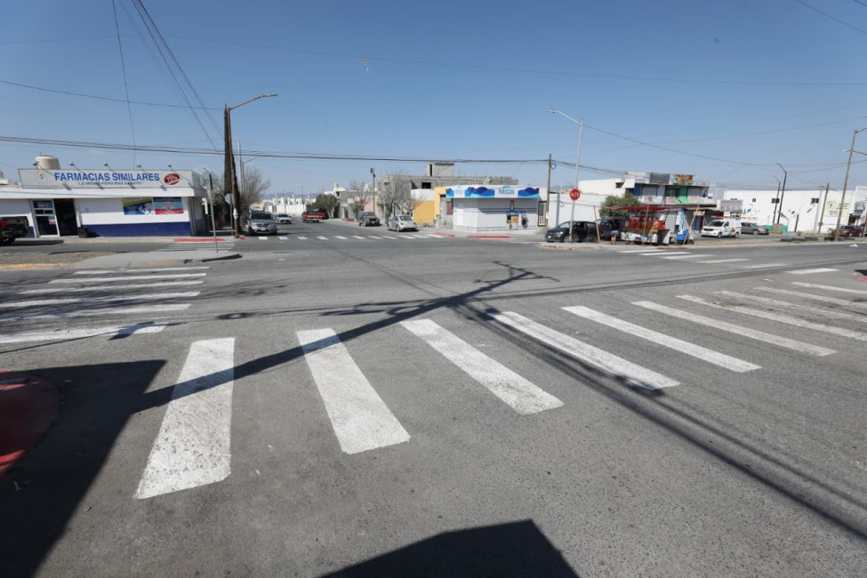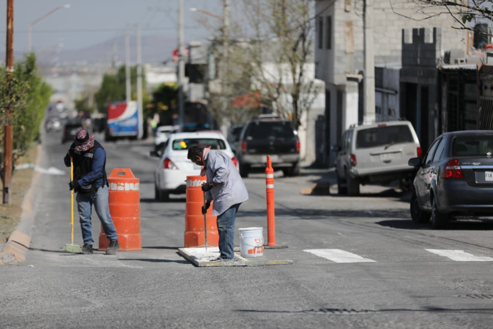 Asimismo, para incrementar la seguridad de niñas, niños, así como madres y padres de familia, personal del Instituto Municipal de Movilidad Urbana Sostenible (IMMUS) en Saltillo delimitó y pintó los cruces peatonales existentes sobre el bulevar Santa Lucía, en su cruce con las calles Prolongación María Dolores García Zendejo y Prolongación Imperio Turco, del fraccionamiento Misión Cerritos.