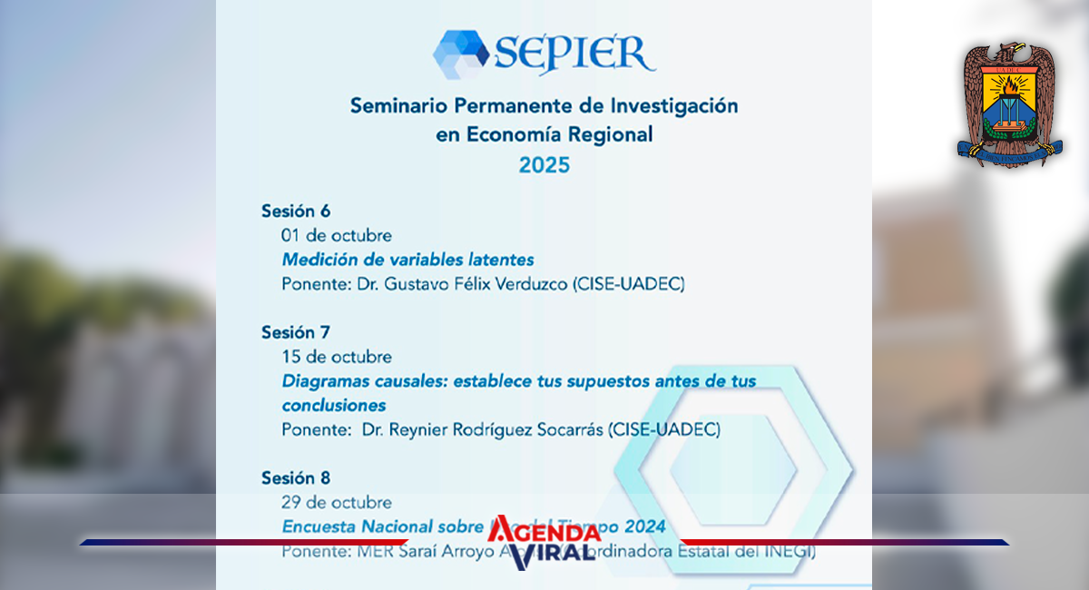 SALTILLO, Coahuila. 13 de octubre de 2025. La Universidad Autónoma de Coahuila a través del Centro de Investigaciones Socioeconómicas (CISE), invita a participar en el Seminario Permanente de Investigación sobre Economía Regional (SEPIER), cuyas sesiones se desarrollan a las 10:00 horas en el Edificio S en Unidad Camporredondo.
