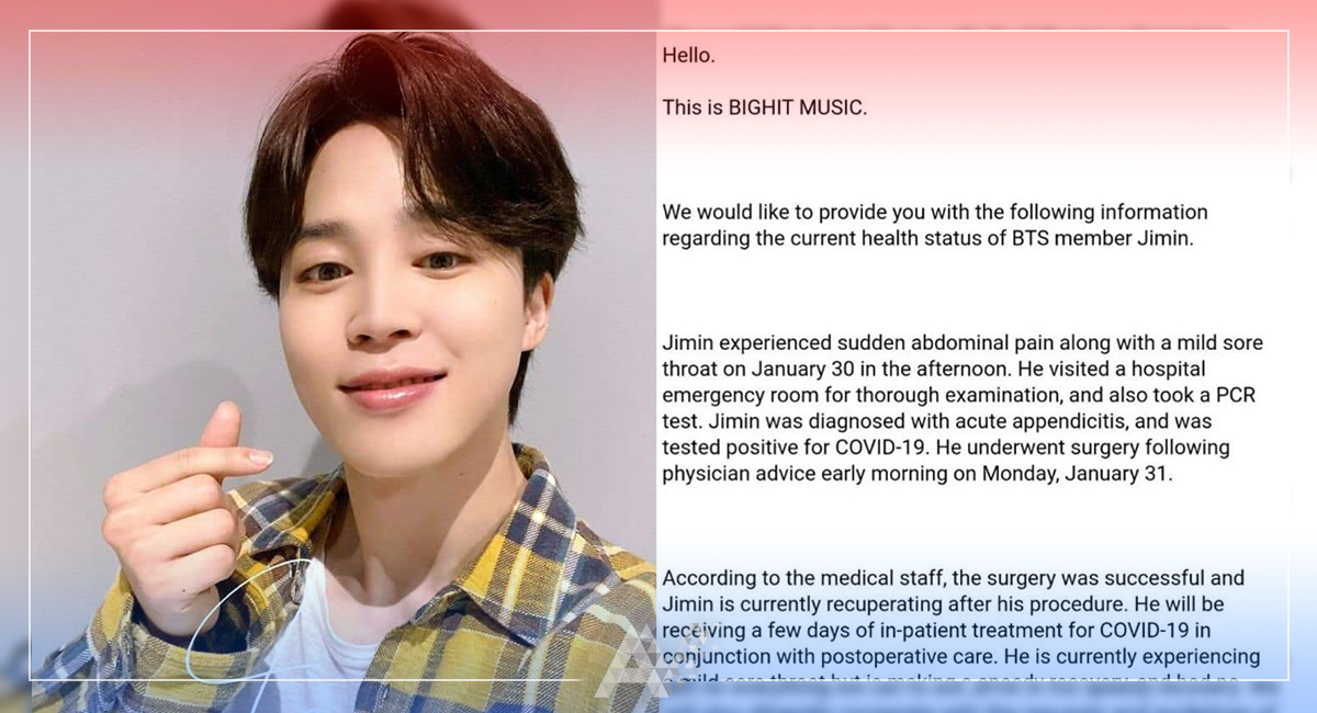 Jimin, cantante y bailarín del grupo de K-pop BTS, dio positivo por coronavirus y también fue operado de apendicitis aguda, informó el lunes su agencia Big Hit Music.