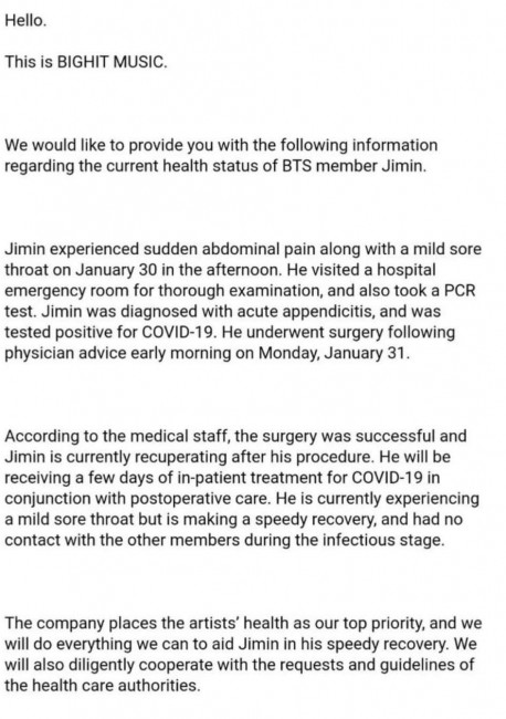 Jimin, cuyo nombre completo es Park Ji-min, acudió al hospital el domingo tras sufrir un repentino dolor abdominal junto con un leve dolor de garganta, informó Big Hit Music en un comunicado.