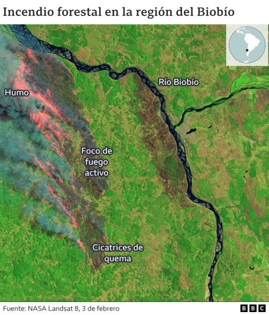 De acuerdo con las cifras del Servicio Nacional de Prevención y Respuesta ante Desastres (Senapred), las llamas han consumido más de 270.000 hectáreas en distintos puntos de las regiones sureñas de Ñuble, Biobío y La Araucanía, en la zona centro-sur de Chile, en medio de una prolongada sequía y un verano con temperaturas inusualmente altas en el sur del país.