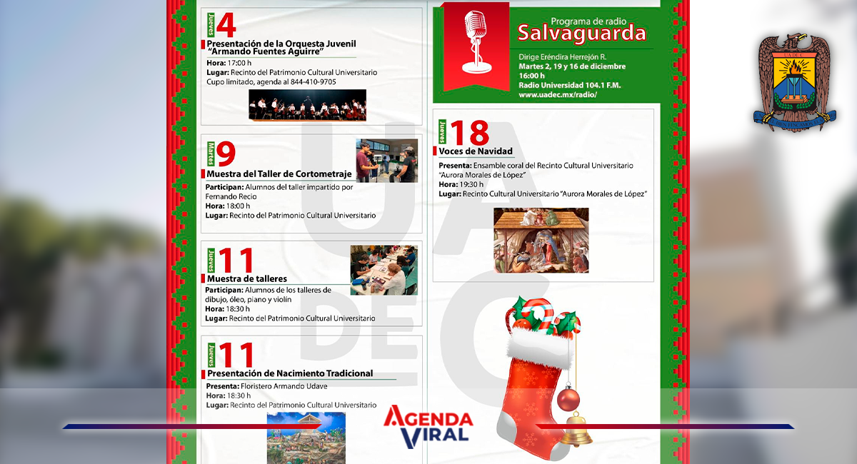 El 4 de diciembre en el Recinto del Patrimonio Cultural Universitario a las 17:00 se presentará la Orquesta Juvenil “Armando Fuentes Aguirre” de la Secundaria No. 8 Adolfo López Mateos, a cargo del director José Castillo Santamaría, con 48 alumnas y alumnos que tocarán distintos temas navideños; el cupo es limitado, para agendar su asistencia llamar al 844 410 9705.