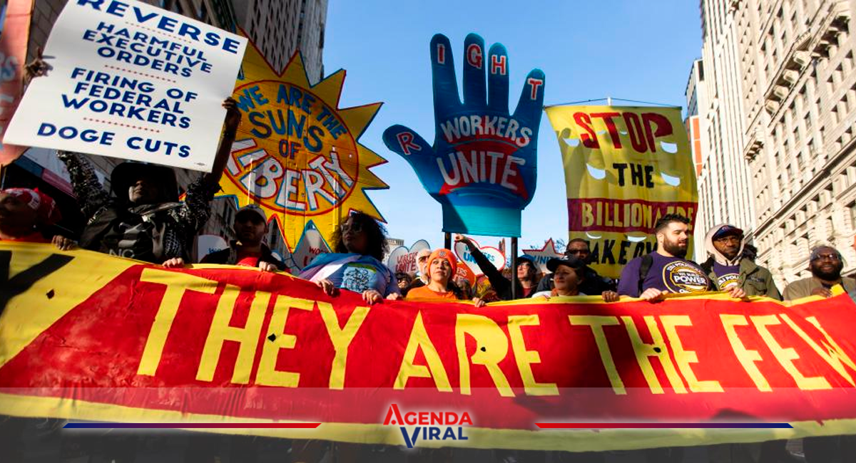 Políticos, activistas sindicales y líderes inmigrantes hablaron en la manifestación, incluida la congresista por Nueva York Alexandria Ocasio-Cortez, quien señaló que el Congreso podría recortar fondos para programas de seguros médicos financiados por el Gobierno, como Medicaid y Medicare.