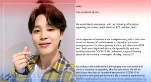 Jimin de BTS es hospitalizado por apendicitis y da positivo a covid-19