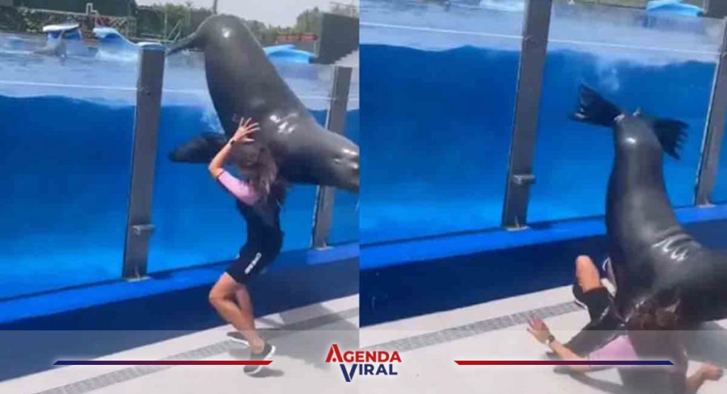 Enorme león marino de 150 kilos casi aplasta a entrenadora en un acuario