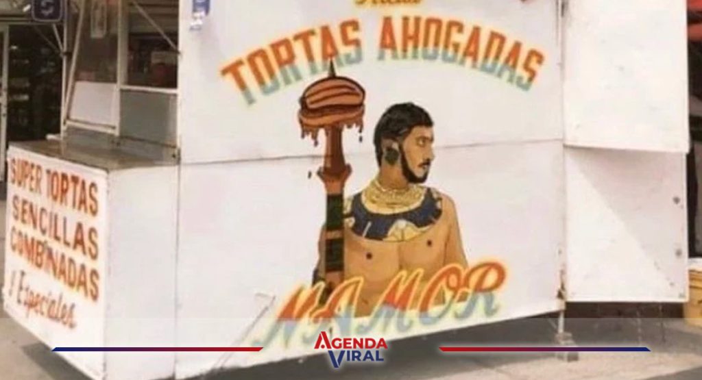 Circula la imagen de un local de comida llamado “Ricas Tortas Ahogadas Namor”, inspirado en el personaje de Tenoch Huerta