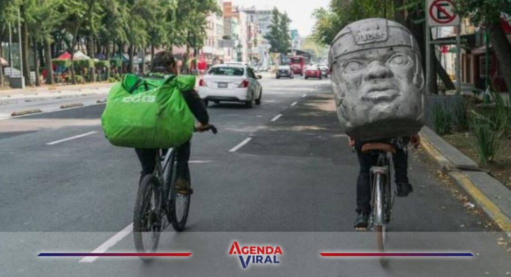 Un repartidor se viralizó por llevar pedidos a las personas dentro de una mochila con forma de Cabeza Olmeca, un homenaje a los Tamemes.