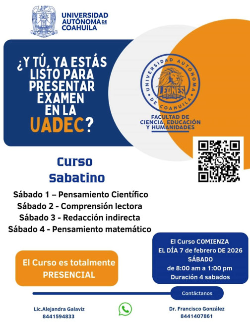 Para más información y detalles, los interesados pueden comunicarse a la Facultad de Ciencia, Educación y Humanidades al teléfono (844) 410 16 85 o enviar mensaje de WhatsApp al (844) 159 48 33 y (844) 140 78 61.