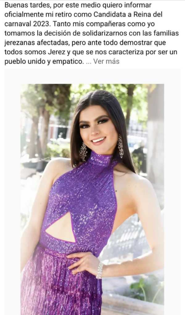 “Buenas tardes, por este medio quiero informar oficialmente mi retiro como Candidata a Reina del carnaval 2023. Tanto mis compañeras como yo tomamos la decisión de solidarizarnos con las familias jerezanas afectadas, pero ante todo demostrar que todos somos Jerez y que se nos caracteriza por ser un pueblo unido y empatico (…)”