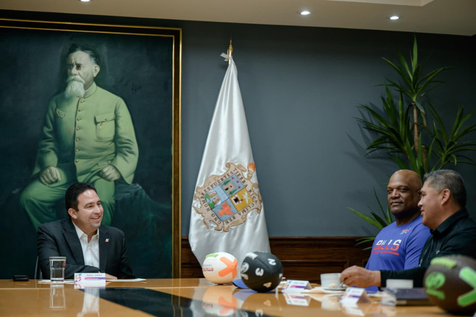 Durante su visita a la Presidencia Municipal, el exjugador de la NFL destacó la seguridad que se vive en Saltillo como un factor fundamental para el desarrollo del deporte.
