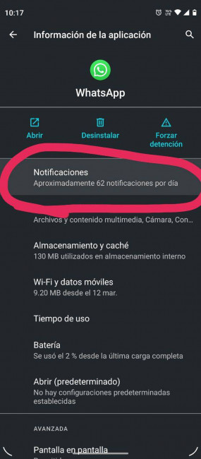 4. Se abrirá la información de WhatsApp. Busca el apartado “Notificaciones”.