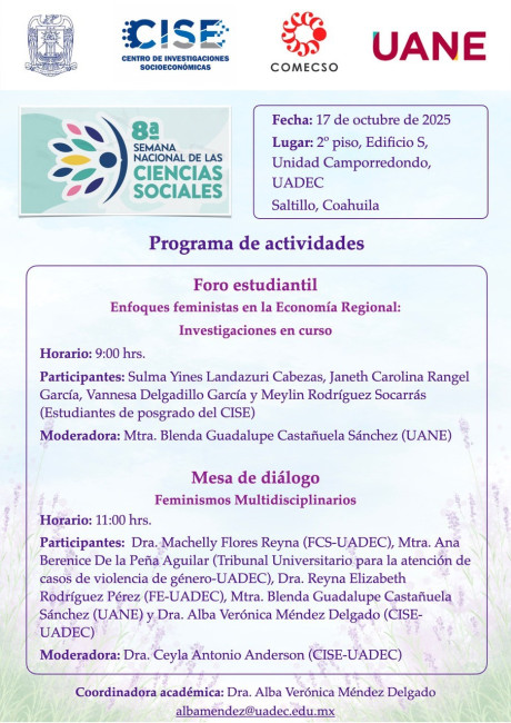 SALTILLO, Coahuila. 16 de octubre de 2025. Como parte de las actividades de la Octava Semana Nacional de las Ciencias Sociales del Consejo Mexicano de Ciencias Sociales (COMENSO), la Universidad Autónoma de Coahuila a través del Centro de Investigaciones Socioeconómicas (CISE), llevará a cabo el 17 de octubre de 2025 el Foro Estudiantil “Enfoques feministas en la Economía Regional: Investigaciones en Curso y la Mesa de Diálogo “Feminismo multidisciplinario”.