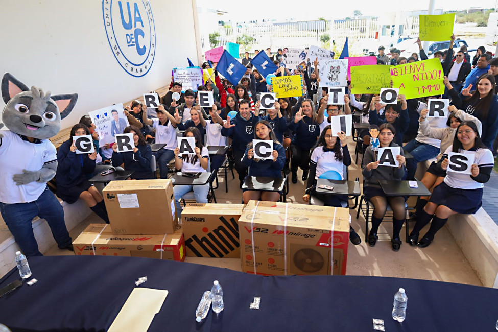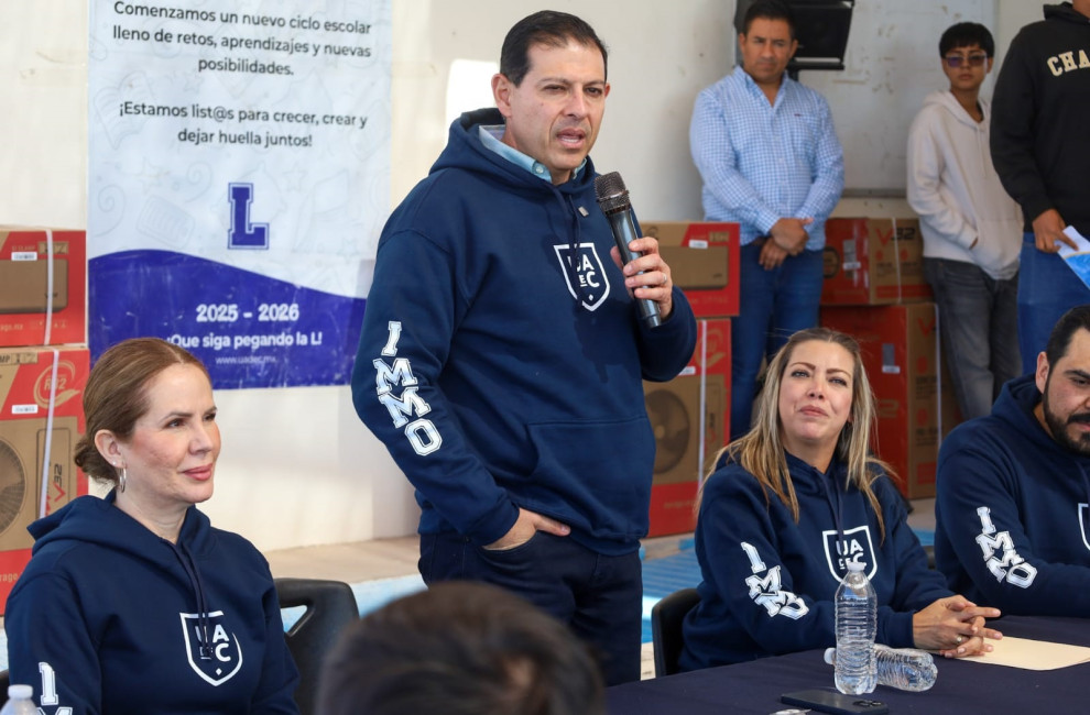 TORREÓN, Coahuila. 11 de noviembre 2025. Para ofrecer a las y los universitarios equipamiento y mobiliario en sus planteles, el rector de la Universidad Autónoma de Coahuila, Octavio Pimentel Martínez, entregó 40 mesabancos, 20 computadoras y cuatro aparatos de aire acondicionado al Instituto “Manuel Muñoz Olivares” (IMMO) y 10 equipos de cómputo al Instituto de Enseñanza Abierta (IDEA) de la Unidad Laguna.