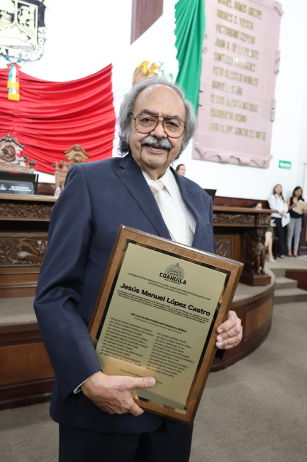 Saltillo, Coahuila, 17 de junio de 2025.- La Sexagésima Tercera Legislatura del Congreso del Estado, realizó un reconocimiento a Jesús Manuel López Castro por 60 años de destacada trayectoria al frente de la estación de radio XHKS, “La Voz del Tiempo en Saltillo”, así como por su legado en defensa del derecho a la libertad de expresión y el ejercicio del periodismo.