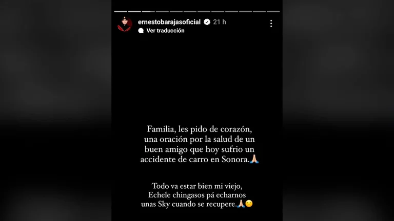 A través de redes sociales, el cantante Ernesto Barajas publicó un post pidiendo por la salud de un buen amigo “Familia les pido de corazón una oración por la salud de un buen amigo que hoy sufrió un accidente de carro en Sonora. Todo va a estar muy bien mi viejo, échele chingasos para echarnos unas Sky cuando se recupere”, escribió.