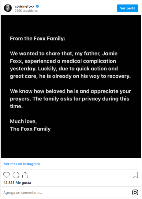 La hija del actor, Corinne Foxx, reveló hace tres semanas que su padre había sido hospitalizado, pero no explicó qué había ocurrido; todo lo que se sabía era que había habido una complicación médica no identificada.