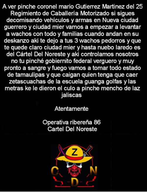 Después mediante un mensaje en redes sociales dicen el porque de esta humillación y que Ciudad Mier y Nuevo Laredo les pertenece, dicen poder con quien se les ponga enfrente, como el Cartel del Golfo, Zetas Vieja Escuela, Cartel Jalisco Nueva Generación (CJNG) e incluso las Fuerzas Federales, lo cierto de esto último y como ya lo repetimos los Sicarios del CDN solo se dedican a correr cuando ven a las Fuerzas Armadas, también amenazaron cobardemente con levantar a las familias de los militares.