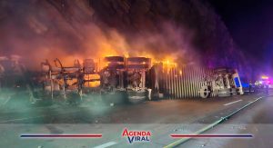 Tráiler se incendia tras aparatoso choque en Los Chorros; chofer resulta ileso