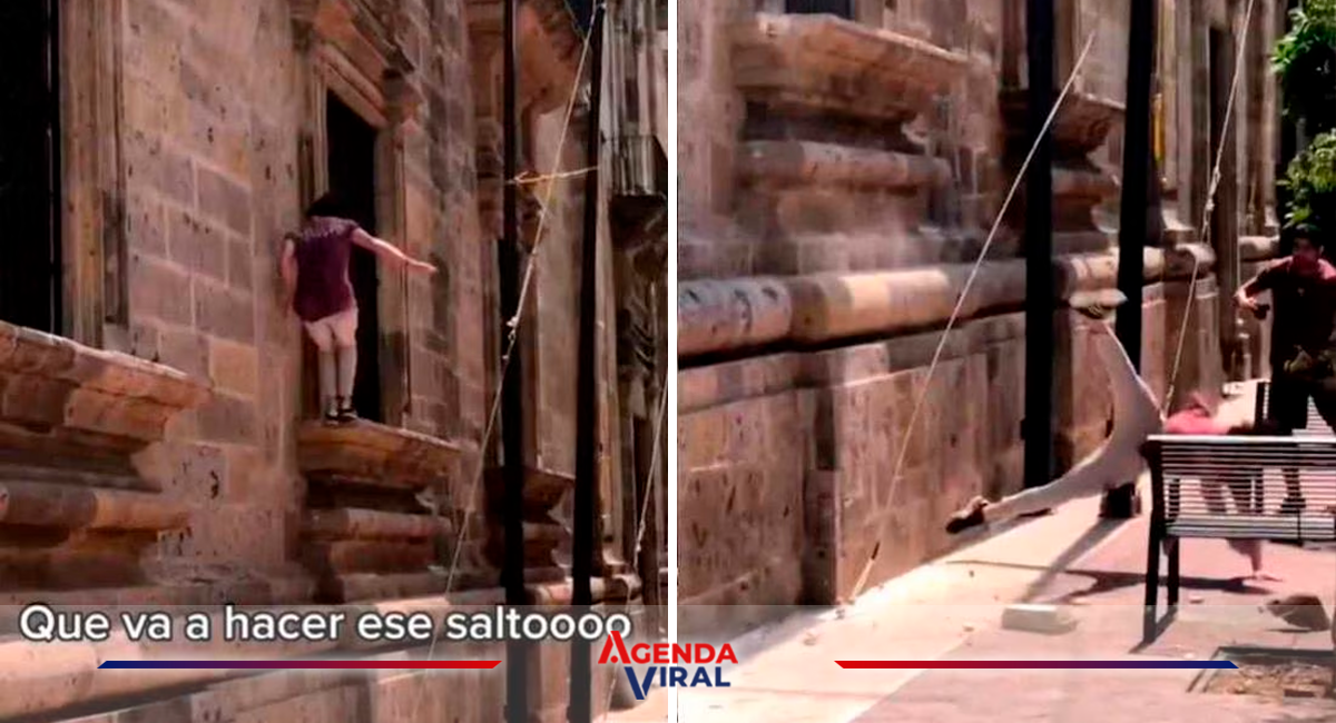Un joven intentó realizar una maniobra de parkour a un costado del Palacio de Gobierno en el Centro Histórico de Guadalajara, pero lo único que logró fue causar daño físico a sí mismo y al inmueble.