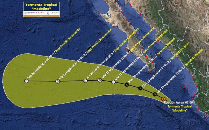 La tormenta tropical ‘Madeline’ se desplaza por la República hacia el noroeste, frente a la costa de Jalisco, lo que ocasionará lluvias y rachas de viento fuertes.