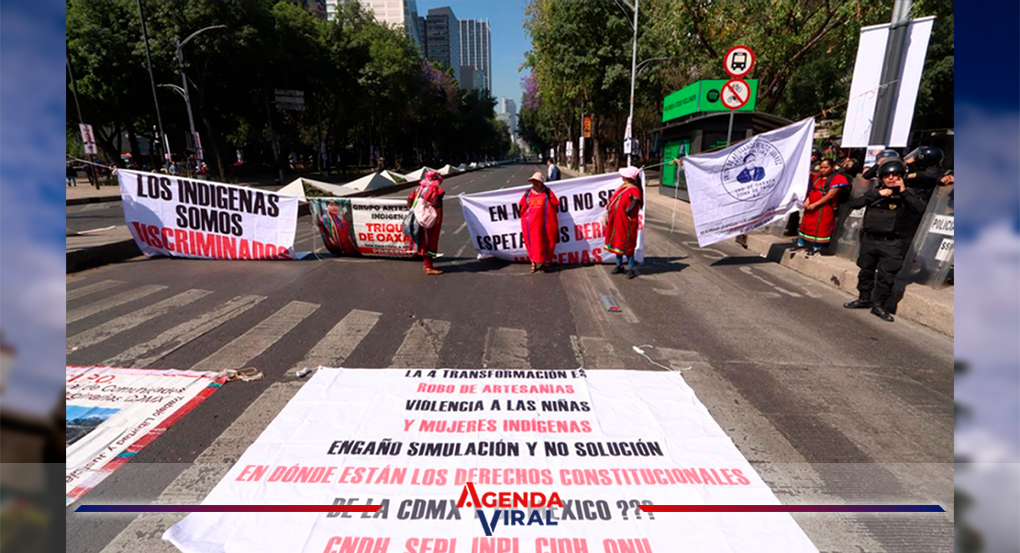 Un contingente de la comunidad Triqui de Oaxaca mantiene un bloqueo en Insurgentes a la altura de Reforma para exigir que se les den espacios de trabajo en donde puedan vender sus artesanías.