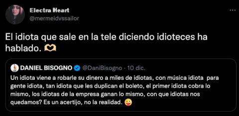 Un idiota viene a robarle su dinero a miles de idiotas, con música idiota, para gente idiota, tan idiota que les duplican el boleto, el primer idiota cobra lo mismo, los idiotas de la empresa ganan lo mismo, con qué idiotas nos quedamos? Es un acertijo, no la realidad”, publicó el conductor.