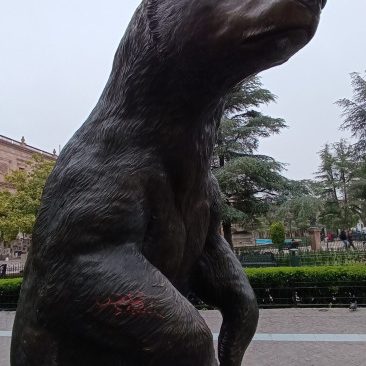Saltillo, Coahuila.- Una de las esculturas de oso ubicadas en Paseo Capital fue recientemente vandalizada con pintura roja, lo que encendió la preocupación de sus autores, los artistas Alejandro Fuentes Gil y Alejandro Fuentes Quezada.