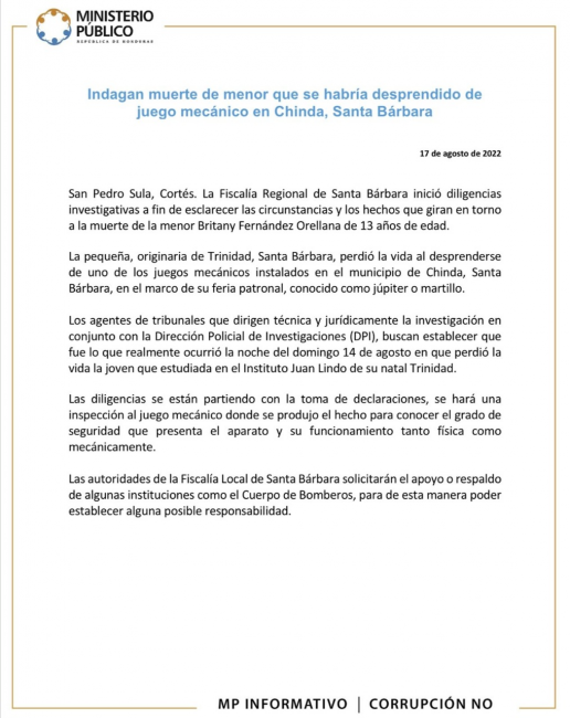 El Ministerio Público (MP) informó este miércoles que indagan en la muerte de la menor Britany Fernández Orellana, de 13 años de edad, quien falleció tras caer de un juego mecánico en Chinda, Santa Bárbara.