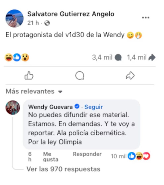 Sin embargo, el daño ya estaba hecho. Diversas cuentas y páginas de redes sociales replicaron y viralizaron el contenido. Una de ellas, identificada como Salvatore Gutierrez Angelo en Facebook —con 31 mil seguidores—, habría compartido capturas del video con mensajes que promovieron su difusión. Ante esto, la página oficial de Wendy respondió directamente, advirtiendo que la publicación de dicho material constituye un delito y que procederán legalmente. “No puedes difundir ese material. Estamos en demandas. Y te voy a reportar a la policía cibernética. Por la Ley Olimpia”, escribió Guevara.